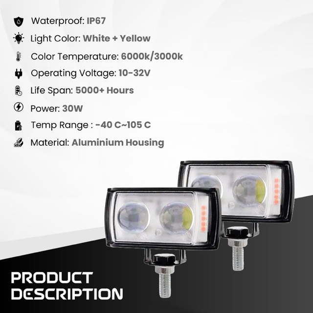 The Lista Owl-Shaped LED Fog Lights deliver a strong 110W illumination output, ensuring clear visibility in challenging driving conditions. Featuring dual-color lighting (Yellow + White), these fog lamps allow you to switch light modes depending on weather and road conditions—white for clear roads and yellow for fog, rain, or dust. Designed for maximum brightness and clarity, these lights enhance safety during night rides, off-road trips, and long highways.